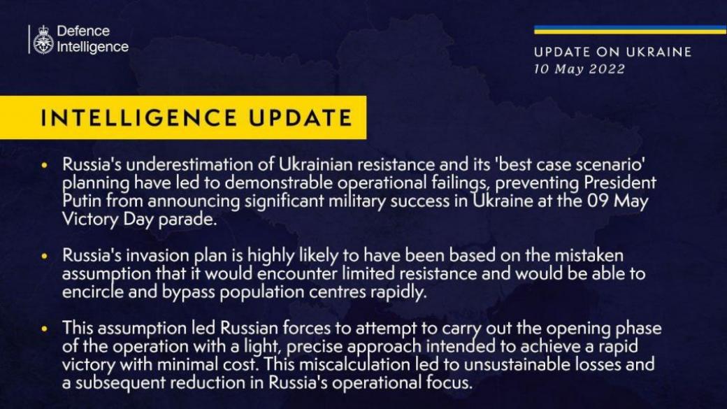 Недооцененность Россией сопротивления Украины и планирование войны по «наилучшему сценарию» привели к очевидным оперативным ошибкам, что не позволило президенту РФ Владимиру Путину объявить о значительном военном успехе в Украине на параде в честь Дня Победы 9 мая. Об этом сообщает Минобороны Британии со ссылкой на разведданные.