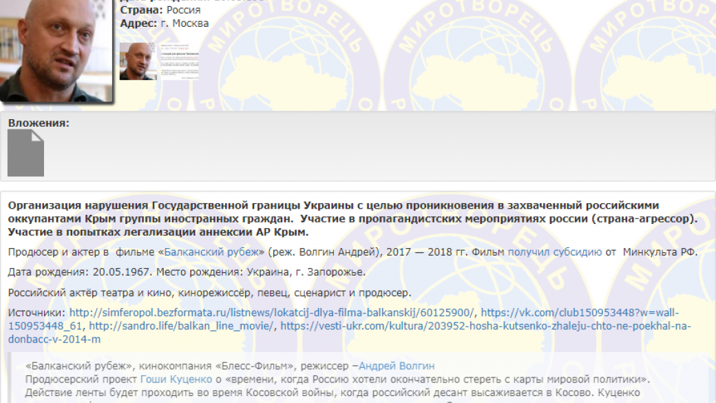 Известный российский актер Гоша Куценко, который родился в Украине, попал в базу волонтерского сайта «Миротворец» из-за участия в пропагандистских мероприятиях России и посещения аннексированного Крыма. Об этом сообщается на официальном сайте организации.