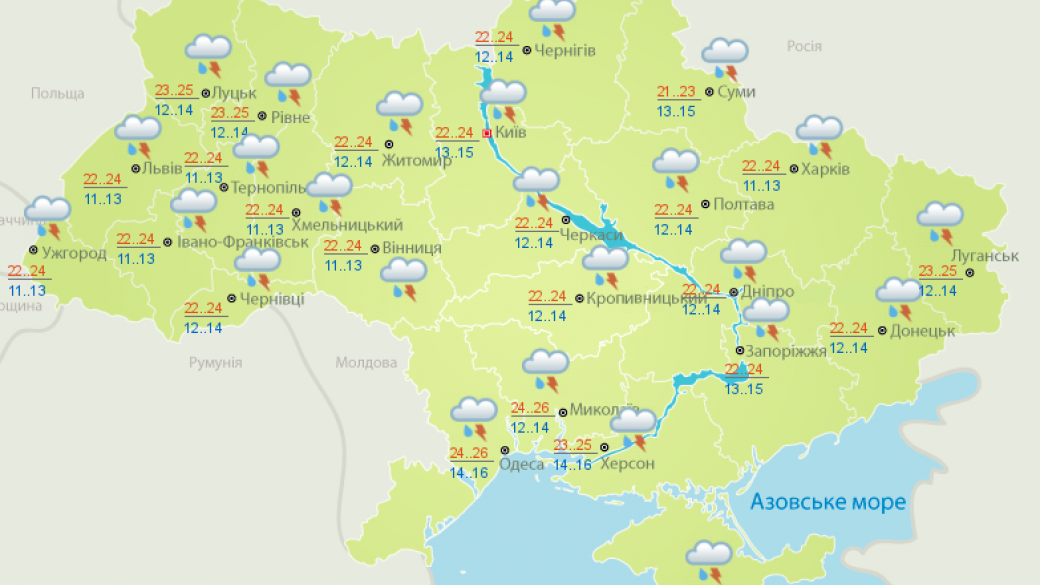 «Днем 10 июня в Украине грозы, в отдельных районах град и шквалы 15−20 м/с. В Киеве и Киевской области днем 10 июня гроза».