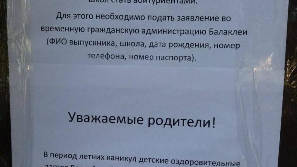 В захваченной российскими войсками Балаклее Харьковской области местным детям российские захватчики предлагают «выехать на лето» в детский оздоровительный лагерь в Россию, а выпускникам украинских школ предлагают поступить в российские высшие учебные заведения. Соответствующие объявления распространяет оккупационная «администрация» города.