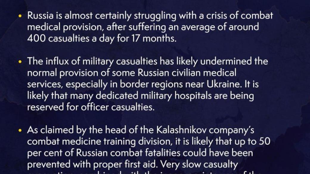 По данным британской разведки, россияне из-за ненадлежащего уровня оказания медицинской помощи раненым несут значительно больше потерь личного состава, чем могли бы.