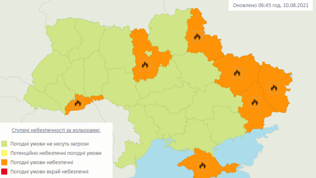 В восточных, западных и южных регионах Украины 10 августа синоптики объявили пожарную опасность. Об этом сообщается на карте, обнародованной Укргидрометцентром.