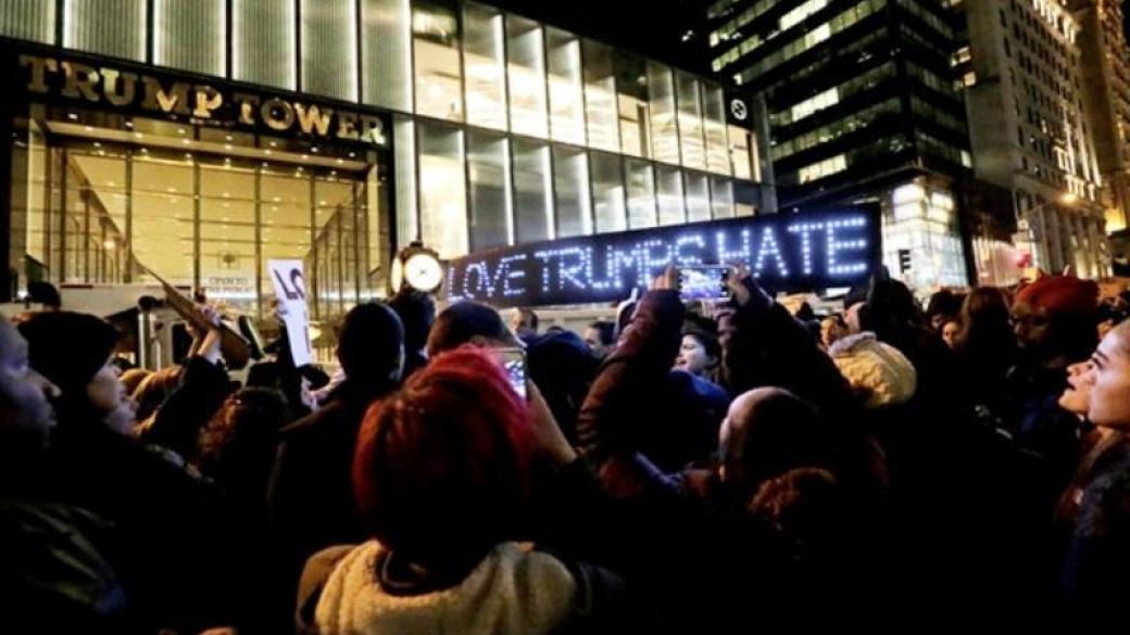 Полиция установила перед Trump Tower баррикады для сдерживания демонстрантов. При этом протестующие отмечают: «Америка не голосовала за политику Дональда Трампа, которой не существуют».