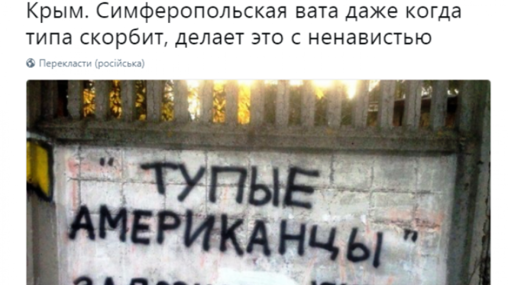 Пользователь КРЫМский бандеровец в своем Twitter-аккаунте разместил соответсвующее фото и написал: «Крым. Симферопольская вата даже когда типа скорбит, делает это с ненавистью».