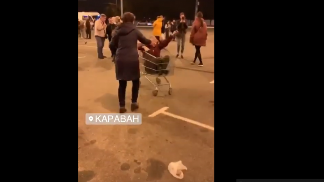 В Днепре на парковке перед торговым центром «Караван» пожилая женщина каталась на тележке из супермаркета. На опубликованном в Ютуб видео можно увидеть, что одна из женщин залезла в тележку, а другая возила ее по парковке.