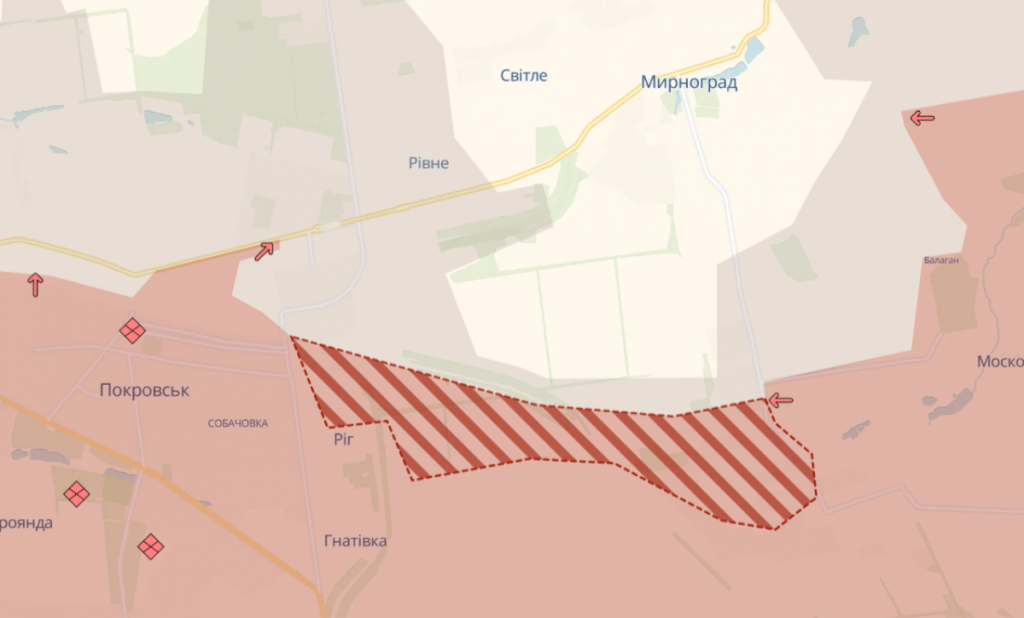 На опубликованной карте зафиксировано установление контроля российскими оккупационными войсками над участком автотрассы, которая соединяет Покровск с Мирноградом. Кроме того, зафиксировано продвижение россиян на восток от Мирнограда.