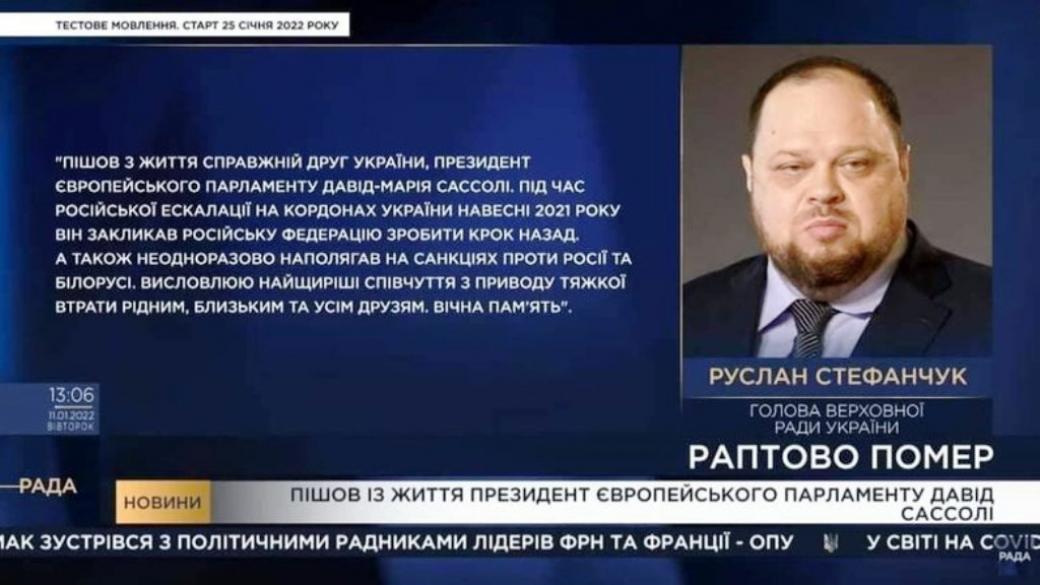 Телеканал «Рада» разместил фото спикера Верховной Рады Руслана Стефанчука рядом с надписью «Внезапно умер», которая касалась президента Европарламента Давиде Сассоли.