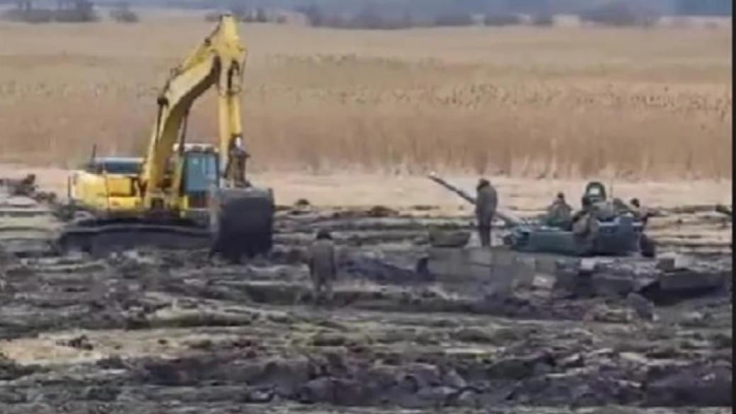В помощь россиянам вывели экскаватор, который на момент съемок опрокидывал землю на поле. Тем временем солдаты, бездельничая, стояли у танков.