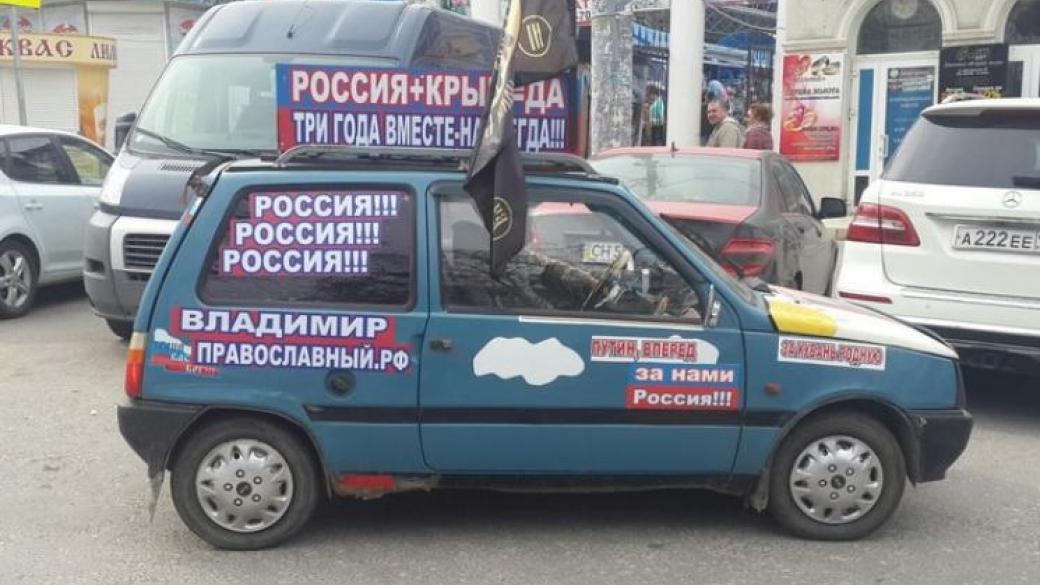 По информации крымчан, по оккупированному Севастополю ездит автомобиль с портретом президента РФ Владимира Путина и призывными лозунгами «Россия, вперед».