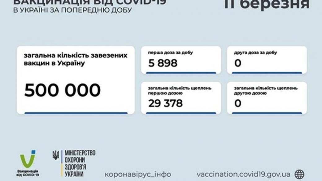 В то же время, две дозы препарата COVID-19 пока не получил никто. По данным ведомства, больше всего прививок за 10 марта было сделано в Тернопольской области — 500 инъекций. При этом лидером прививочной кампании остается Донецкая область — 3 504 уколов. Меньше всего граждан привито на Закарпатье — 494 прививки: