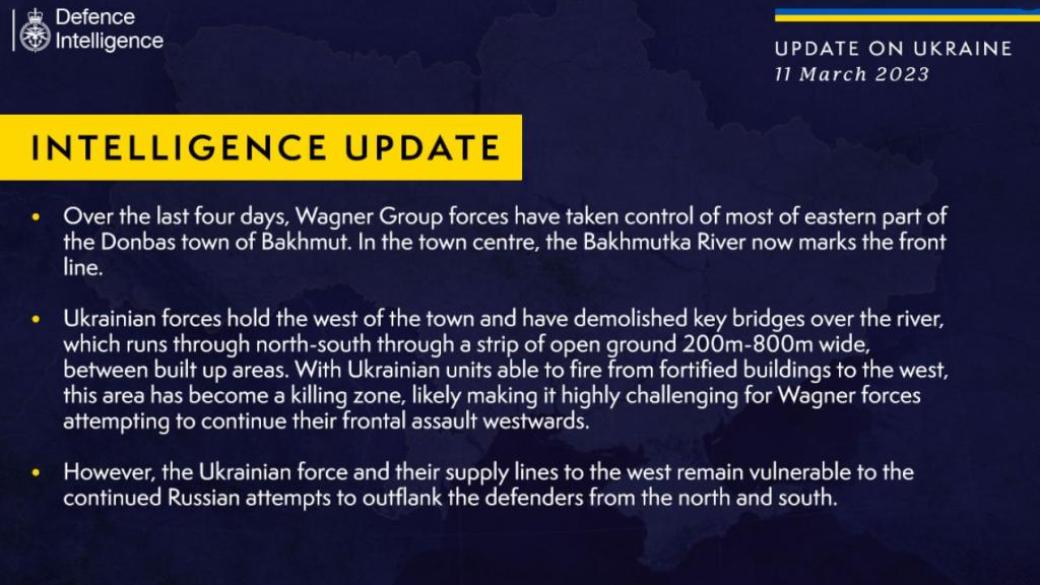 ЧВК "Вагнер" за последние четыре дня захватила большую часть восточной половины города Бахмут Донецкой области и сейчас в центре города река Бахмутка проходит по линии фронта. Об этом сообщает Министерство обороны Великобритании в Twitter.
