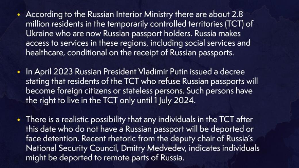 В британской разведке со ссылкой на данные МВД россии уточнили, что на временно оккупированных территориях Украины проживает около 2,8 млн жителей, которые якобы уже являются владельцами российских паспортов. При этом в апреле 2023 года президент россии Владимир Путин издал указ, согласно которому жители захваченных территорий, отказывающиеся от российских паспортов, станут иностранными гражданами или лицами без гражданства и имеют право проживать там только до 1 июля 2024 года.