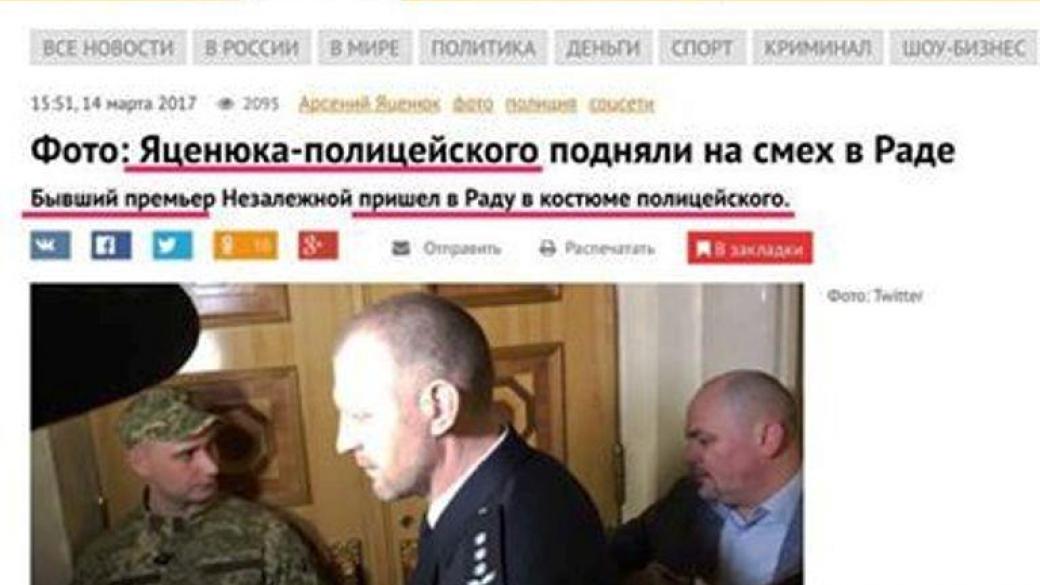 Российское издание перепутало народного депутата от «Народного фронта» Тетерука с экс-премьером Арсением Яценюком, пришедшего в Верховную Раду в униформе украинской полиции.
