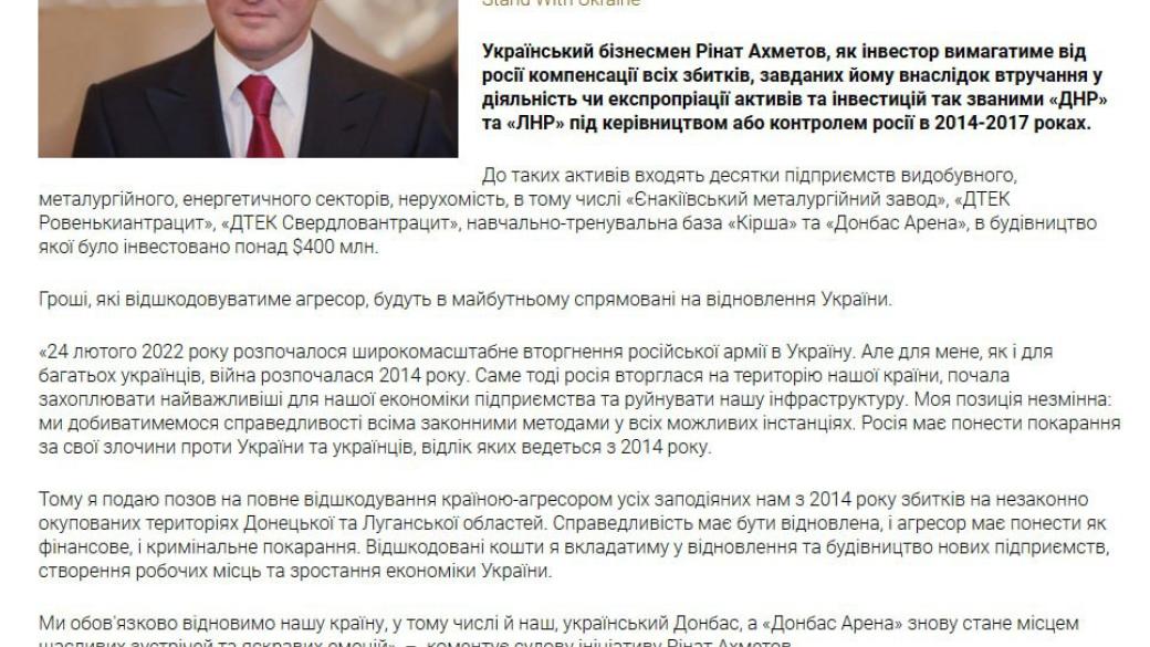 "Я подаю иск на полное возмещение страной-агрессором всех причиненных нам с 2014 года убытков на незаконно оккупированных территориях Донецкой и Луганской областей. Справедливость должна быть восстановлена, и агрессор должен понести как финансовое, так и уголовное наказание. Возмещенные средства я буду вкладывать в восстановление и строительство новых предприятий, создание рабочих мест и рост экономики Украины".