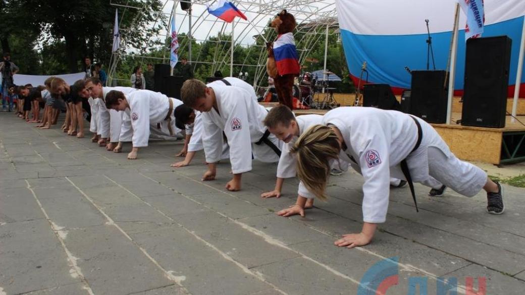 «Русская пробежка» стартовала от столичного стадиона «Авангард». Юноши и девушки пробежали по центральным улицам Луганска — Оборонной и Советской — с флагами России и Луганской Народной Республики и лозунгами «Мы — луганчане, и мы гордимся этим!», «Вместе — мы едины, мы непобедимы!».