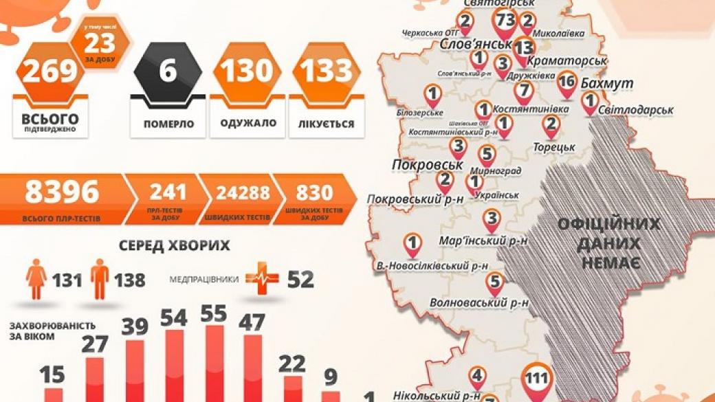 Всего в Донецкой области уже 269 случаев коронавирусной болезни. 6 из них с летальным исходом. 130 пациентов выздоровели.