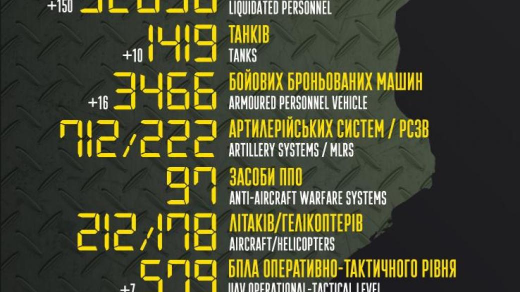 С начала полномасштабного российского вторжения в Украину общие боевые потери противника с 24.02 по 11.06 ориентировочно составили около 32 050 (+150) человек личного состава. Об этом сообщает Генштаб ВСУ.