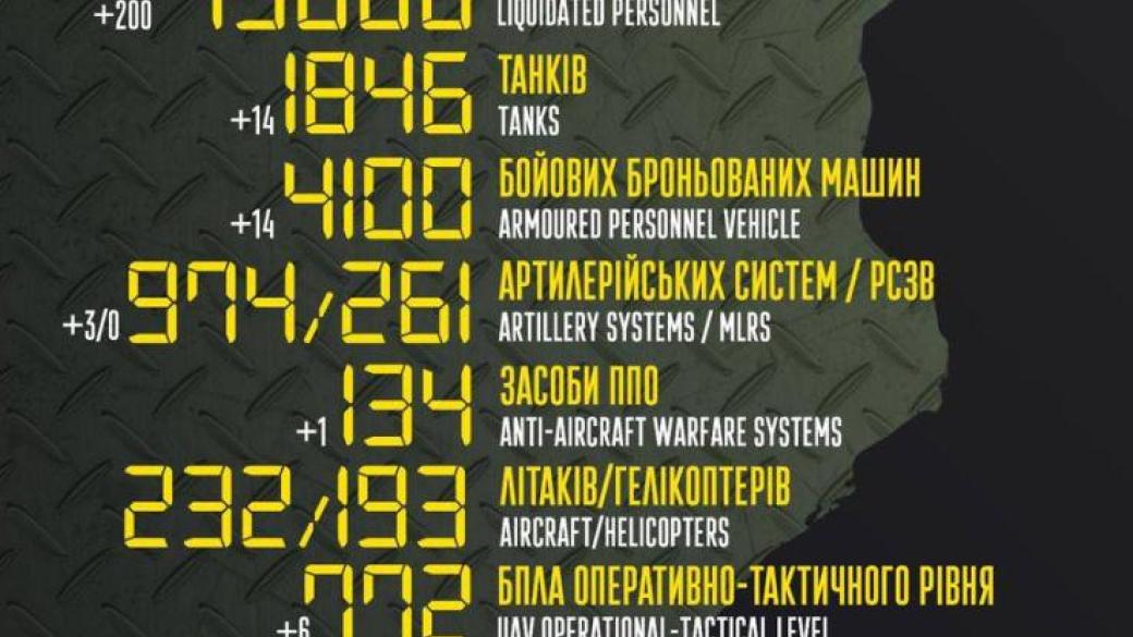 По данным командования с начала полномасштабного вторжения РФ общие боевые потери РФ составили: