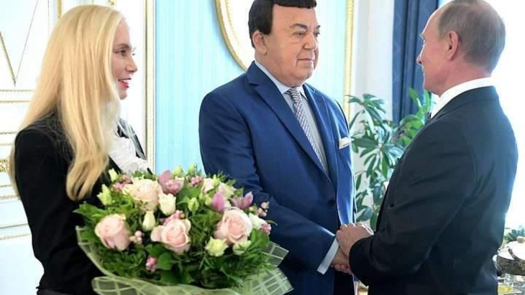 В пресс-службе Кремля сообщили, что Путин принял Кобзона и его жену Нинель в Кремле. При этом Кобзону преподнесли в подарок картину «Шахтерская песня» Александра Зеленского.