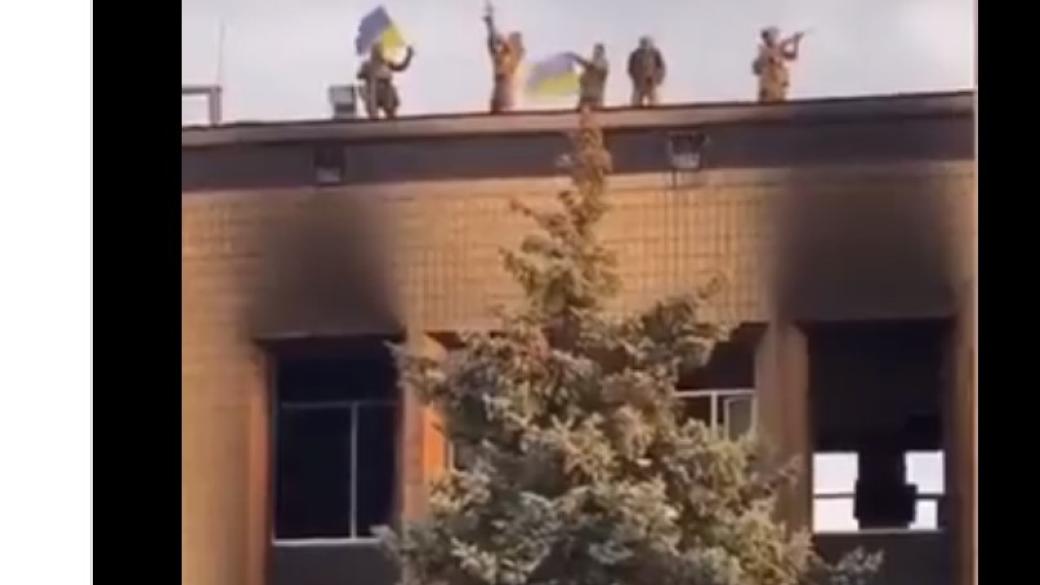 На опубликованном Штефаном видео можно заметить сгоревшее здание горсовета Изюма на крыше которого стоят бойцы ВСУ с украинскими флагами.