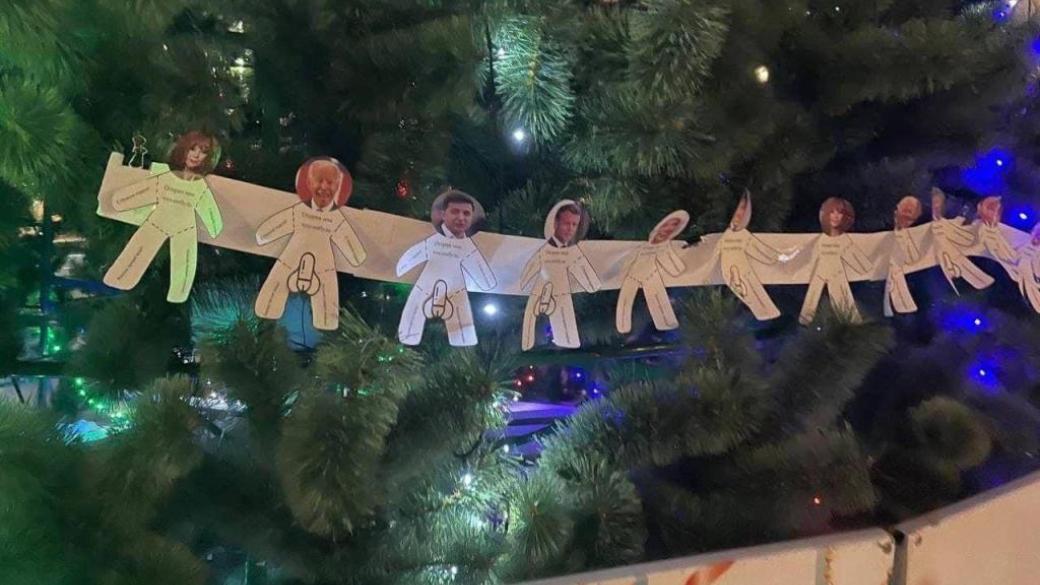 Новогоднюю елку в центре российской Твери украсили бумажные фигурками Байдена, Зеленского, Макрона, а также Пугачевой и Галкина.