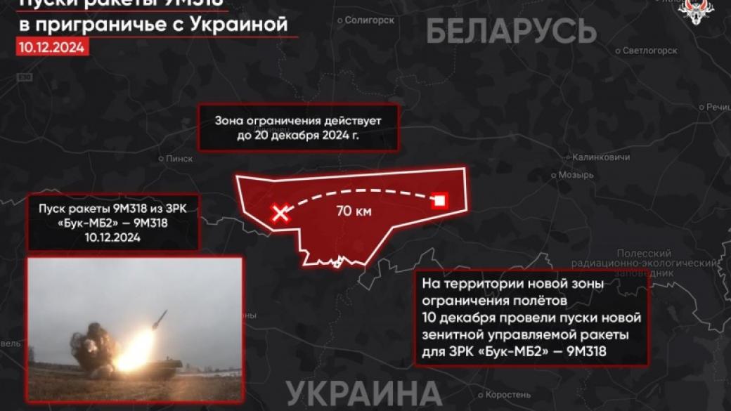 10 декабря Беларусь испытала новую ракету для ЗРК "Бук-МБ2" у границ с Украиной. Это повлекло объявление воздушной тревоги в северных областях Украины. Об этом сообщил Цензор.НЕТ со ссылкой на мониторинговый канал "Белорусский Гаюн".