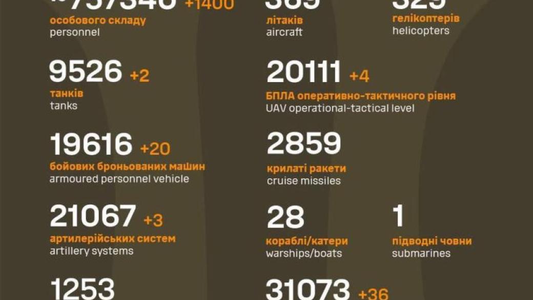 За минувшие сутки украинские защитники ликвидировали 1400 российских захватчиков и уничтожили десятки единиц техники и вооружения оккупантов.