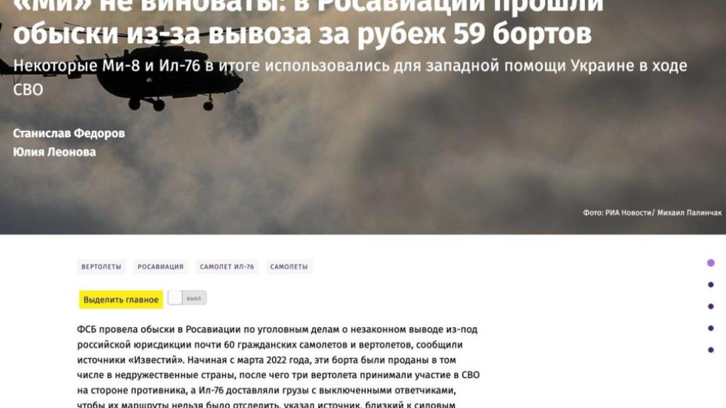 Как сообщают российские СМИ, ФСБ возбудила уголовные дела против руководства росавиации из-за вывода за рубеж 59 самолетов и вертолетов.
