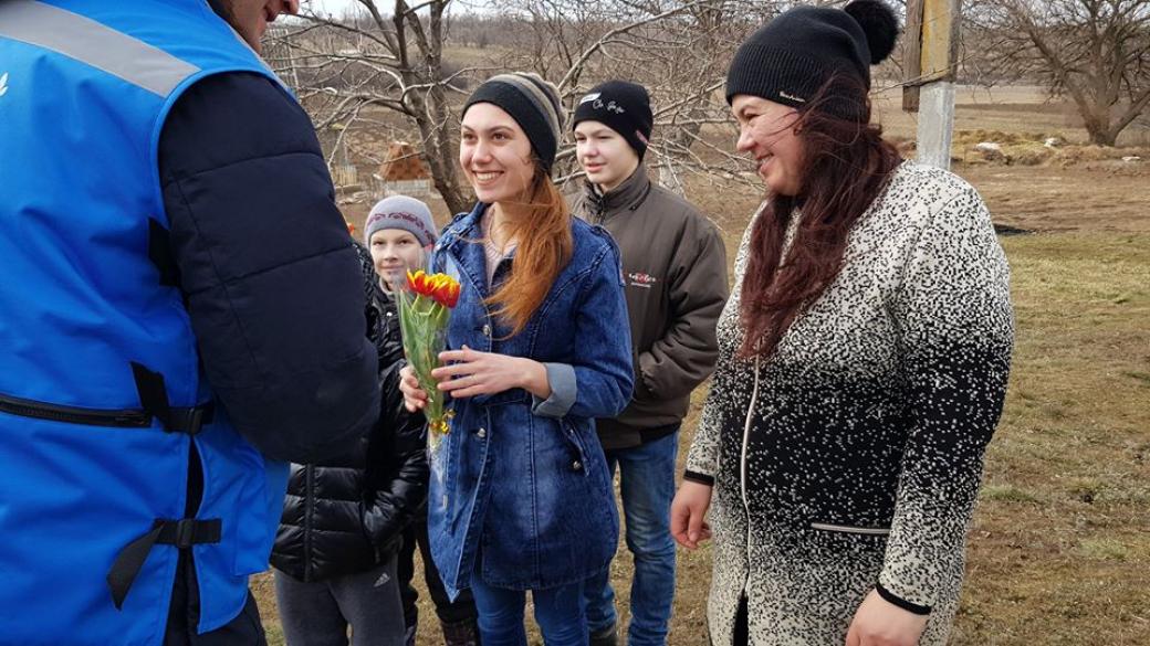 С 8 Марта жительниц прифронтового поселка Новогригорьевка Донецкой области поздравила команда Гуманитарной миссии «Пролиска» при поддержке неравнодушных граждан. Об этом на своей странице в Facebook рассказал координатор миссии Евгений Каплин.