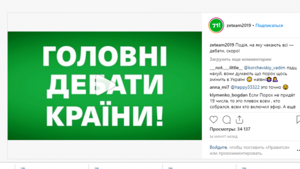 Кандидат в президенты Украины и украинский комик Владимир Зеленский намерен провести дебаты с действующим главой государства Петром Порошенко 19 апреля на НСК «Олимпийский». Об этом сообщается в социальных сетях на страницах «Команды Зеленского».