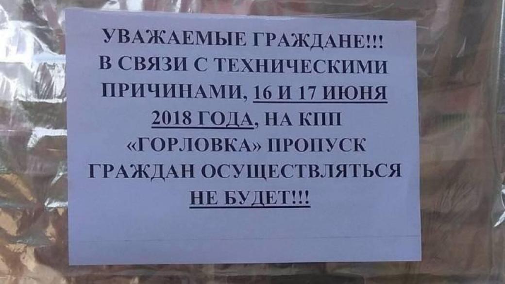 В объявлениях, вывешенных в Горловке, сказано, что «16 и 17 июня 2018 года на КПП „Горловка“ пропуск граждан осуществляться не будет».