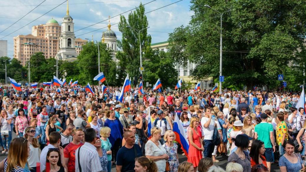 У участников в руках флаги РФ. Часть людей скандирует: «Донбасс — это Россия!», «Россия — наш дом!», «Мы выбираем Россию!»