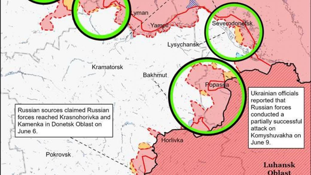 Российские войска продолжали вести наземные наступления в районе Северодонецка, но украинские защитники сохраняют контроль над промышленным районом города. Также захватчики возобновили усилия по перерезанию трассы Т1303 Горно-Лисичанск и начали неудачный штурм населенных пунктов вдоль трассы Т1302 Бахмут-Лисичанск.