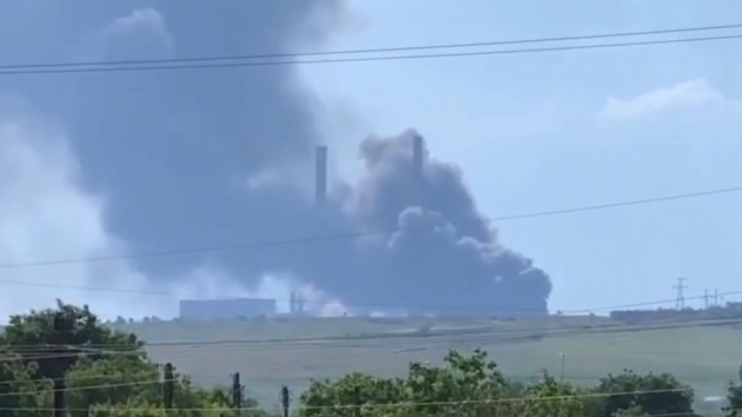 В городе Светлодарске Донецкой области сильный пожар на Углегорской ТЭС. Соответствующие кадры публикуют ряд СМИ.