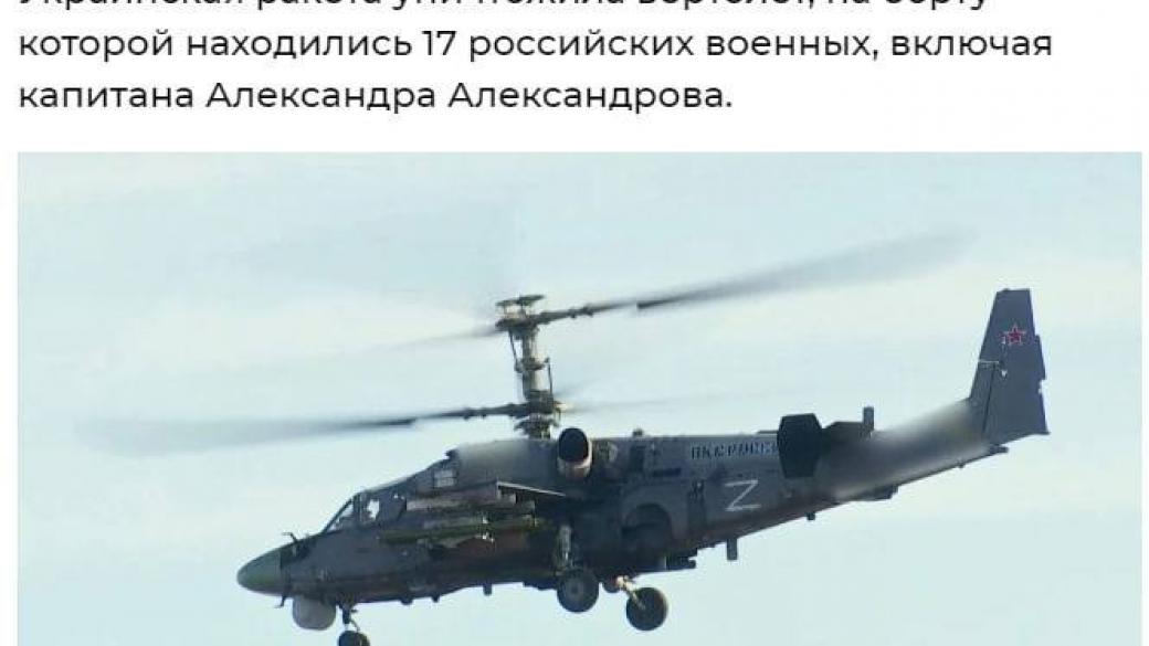 ВСУ сбили вертолет с 17 военнослужащими армии РФ. Россияне уничтожены.