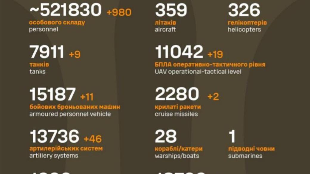 По данным генштаба ВСУ, потери российской армии таковы: