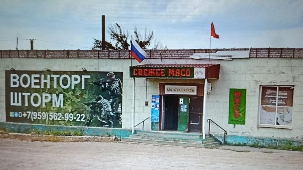 Как видно на опубликованном в сети фото, рядом с большим баннером военторга «Шторм», на котором изображены фигуры российских солдат, над главным входом в здание появилась вывеска «Свежее мясо».