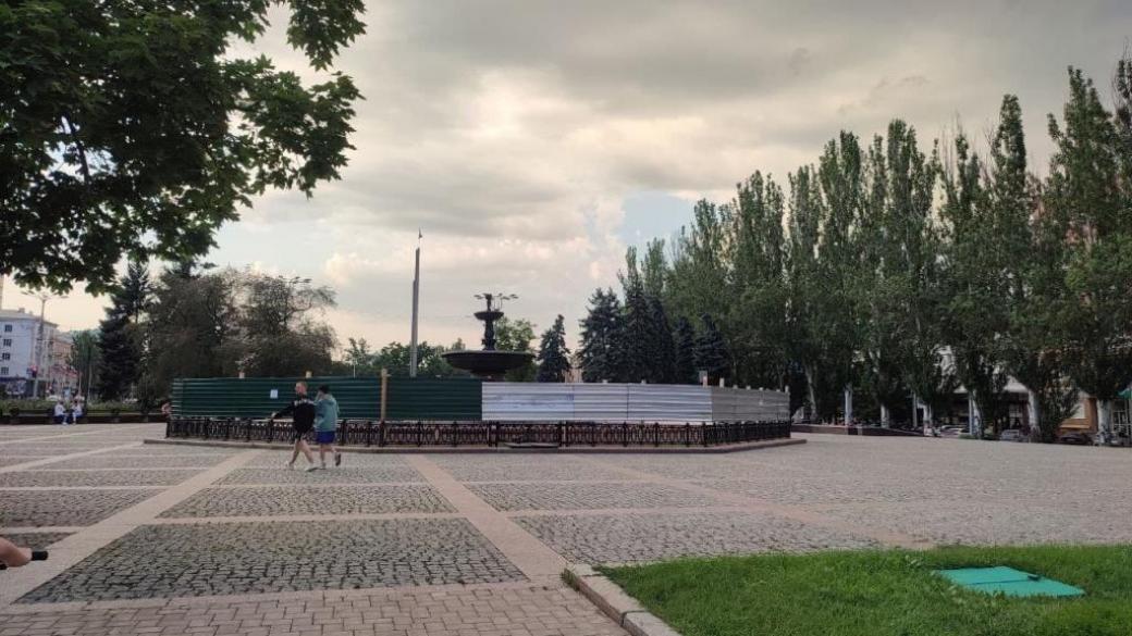 В июльскую жару дончане остались без центрального фонтана. В Донецке на площади Ленина фонтан огорожен: «власти» заявили о текущем ремонте. Правда, рабочих на огороженной территории нет, о чем пишут местные паблики в соцсетях.