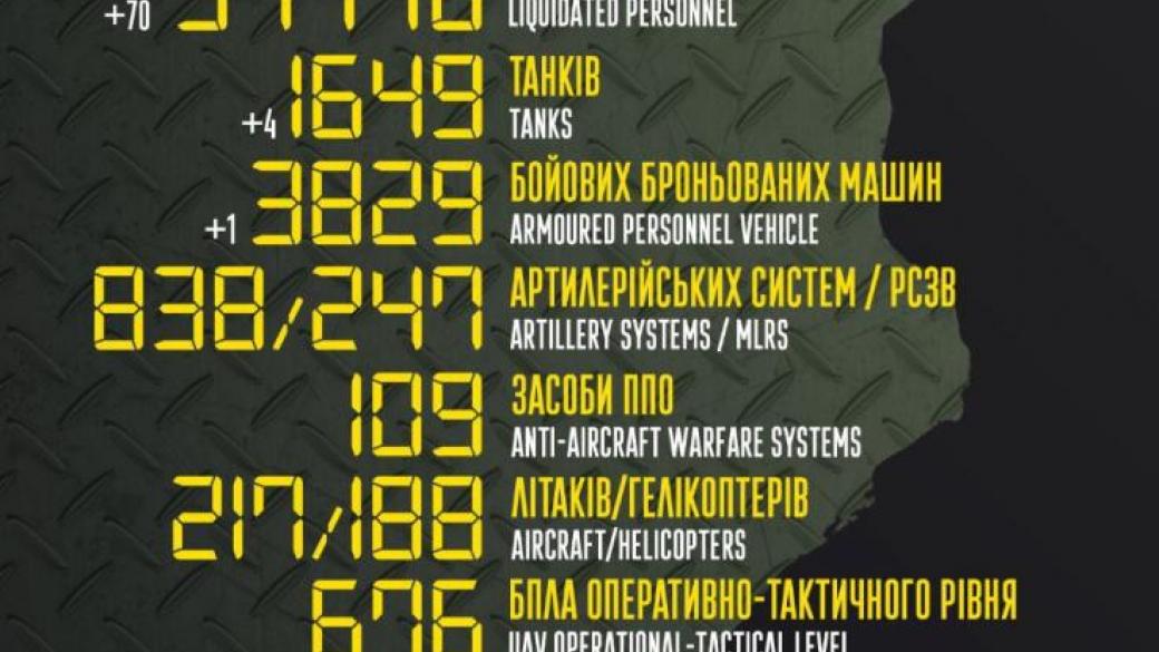 С начала полномасштабного российского вторжения общие боевые потери войск РФ с 24.02 по 12.07 ориентировочно составили около 37470 (+70) человек ликвидировано. Об этом сообщает Генштаб ВСУ.