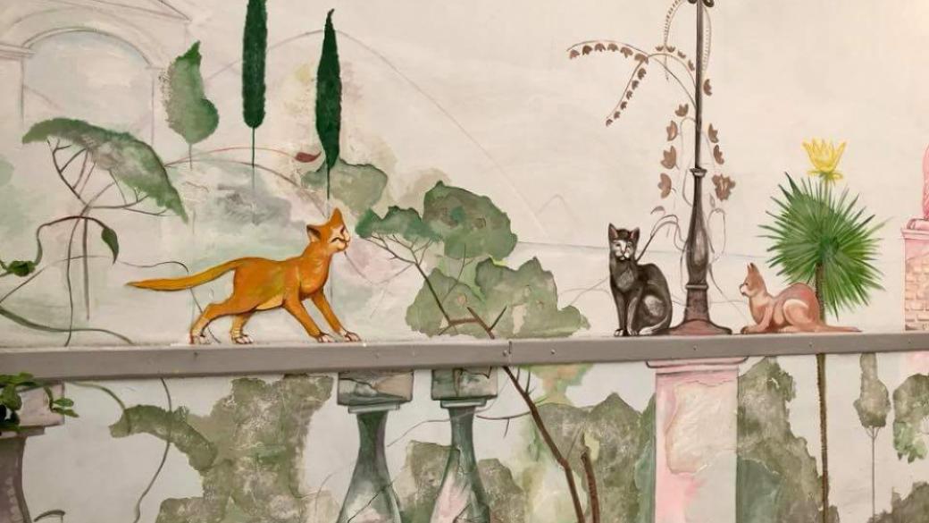 Стены подъезда покрыты легкими, изящными рисунками. На них — уютные одесские дворики с пестрой южной растительностью, многочисленными скульптурами и фонтанчиками в стиле соцреализма и, конечно, неизменные обитатели этих двориков — коты всех мастей.