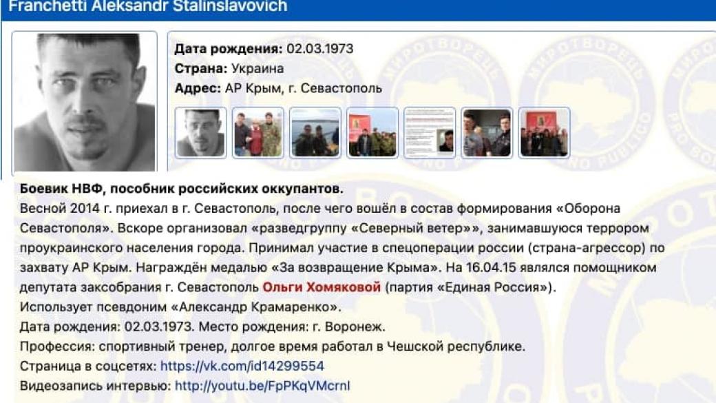 Уроженец Воронежа приехал в Севастополь весной 2014 года, организовал «разведгруппу «Северный ветер», занимавшуюся террором проукраинских жителей города. Руководя «разведгруппой», поддерживал связь с морпехами ЧФ РФ. В группу Франчетти входил сербский наемник Деян Берич («Деки»), неоднократно приезжавший в Донбасс как «инструктор» незаконных вооруженных формирований. Франчетти получил медаль «За возвращение Крыма».