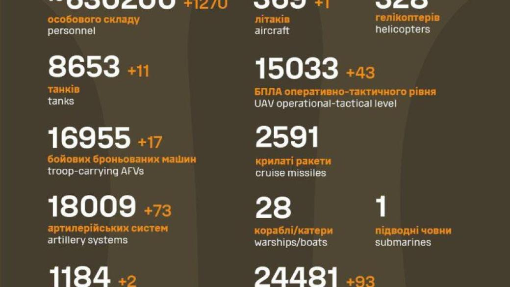 За минувшие сутки ВСУ ликвидировали 1270 оккупантов и более 200 единиц техники.