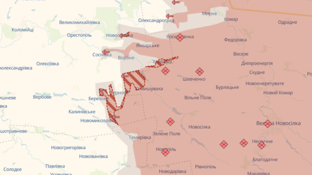 Войска рф продвинулись вблизи сел Новоселовка, Малиевка, Терновое и Березовое Днепропетровской области. Об этом сообщили аналитики мониторингового проекта DeepState.