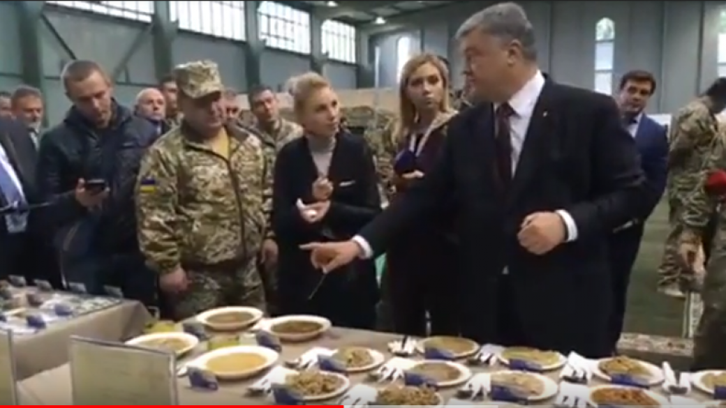 Президент Украины Петр Порошенко побывал на презентации нового пищевого обеспечения украинских военнослужащих, там он сам попробовал еду, которая теперь будет входить в рацион украинских солдат.