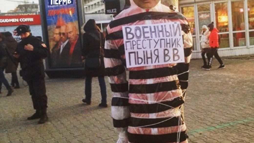 В российском городе Пермь к столбу неизвестные привязали самодельный манекен с лицом президента РФ Владимира Путина, на котором при помощи черного скотча сымитировали рисунок полосатой тюремной робы. Об этом сообщают российские СМИ, ссылаясь на сообщество «Подслушано Пермь» в соцсети.