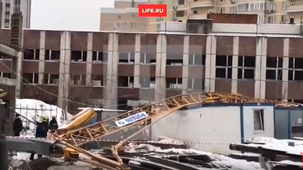 В Москве в районе Тропарево-Никулино сегодня на стройплощадке пожарного депо на бытовку с рабочими рухнул 20-метровый башенный кран.