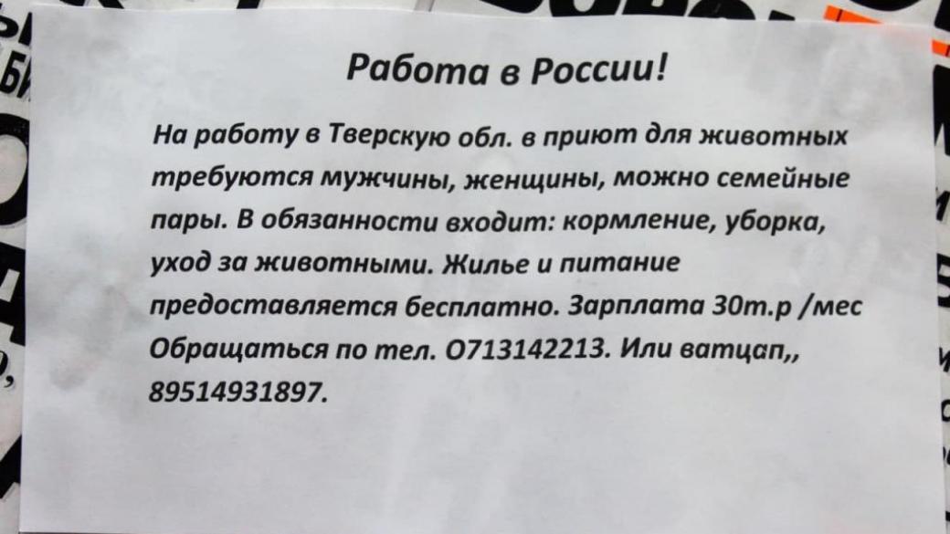 Так, в тексте объявления сказано, что вакансии для мужчин и женщин, а также семейных пар есть в одном из приютов Тверской области России. При этом потенциальным кандидатам обещают бесплатное жилье и питание, а также зарплату в 30 тысяч рублей. Кроме того, указаны и обязанности, которые необходимо выполнять — уход за животными, уборка и кормление. Фото объявления публикуют очевидцы в соцсети.
