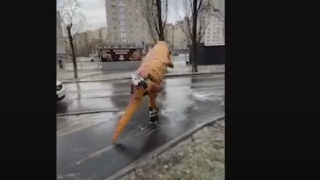 В Киеве после ледяного дождя, который превратил улицы в сплошной каток, мужчина в костюме динозавра катался на коньках в костюме динозавр.