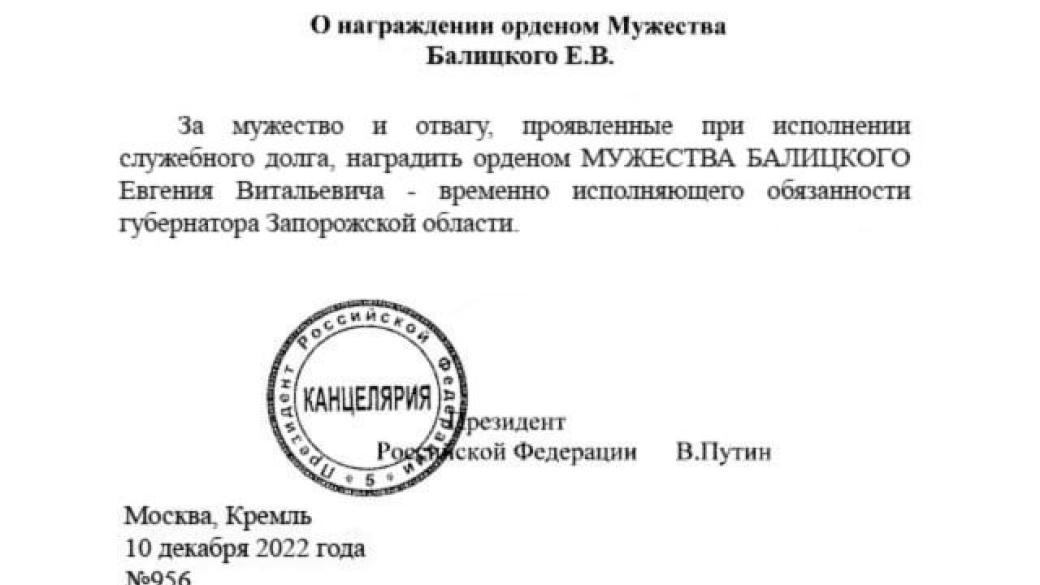 Гауляйтера оккупированной части Запорожской области Евгения Балицкого в честь дня рождения Путин наградил «орденом мужества» за террористическую деятельность на временно оккупированной территории Запорожской области.