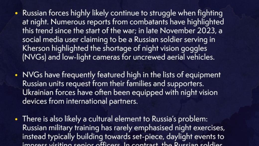 Кроме того, в разведке предположили, что российская военная подготовка редко уделяет внимание ночным учебам, проводя стандартные постановочные мероприятия для того, чтобы поразить старших офицеров. При этом российский солдат утверждал, что украинские силы "двигаются в основном ночью".
